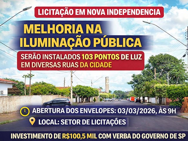 NOVA INDEPENDÊNCIA - A prefeitura realizará, no dia 03 de março, o processo licitatório para execução de melhorias no sistema de iluminação pública em diversos pontos do município. A disputa ocorrerá na modalidade Concorrência Presencial, sob regime de empreitada por preço global.